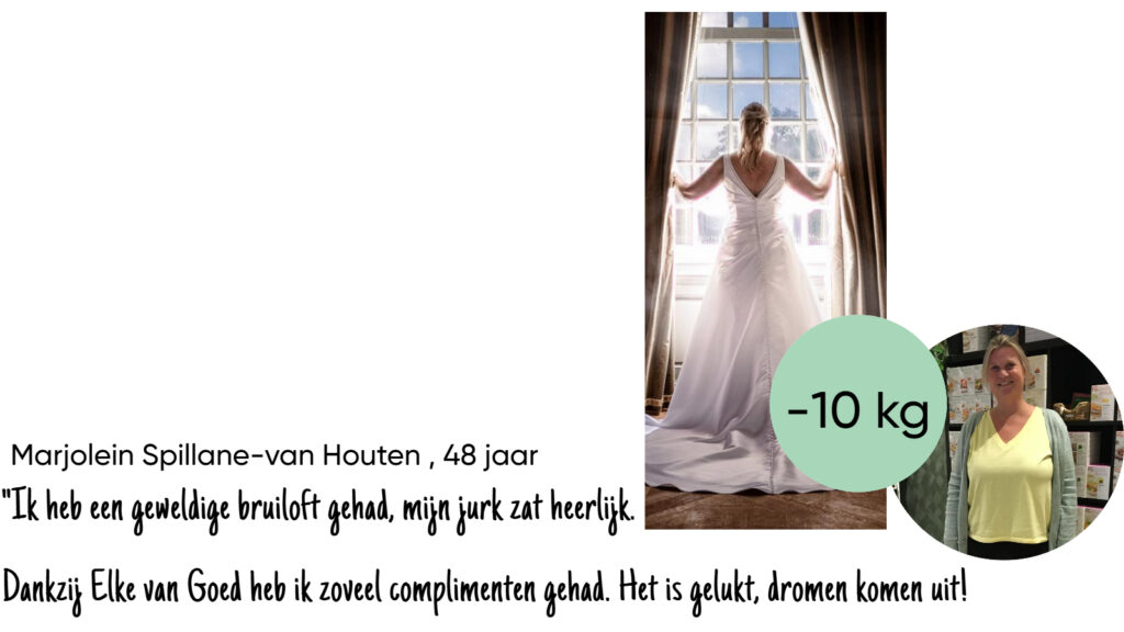 In ruim drie maanden ben ik erin geslaagd om 10 kilo af te vallen. Mijn doel was om slank op mijn bruiloft te zijn, en de resultaten zijn geweldig. Dit had ik nooit kunnen bereiken zonder de steun van het programma PS. Food & Lifestyle en mijn coach Elke.